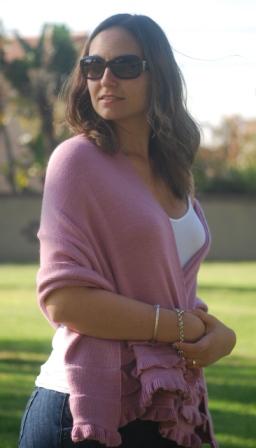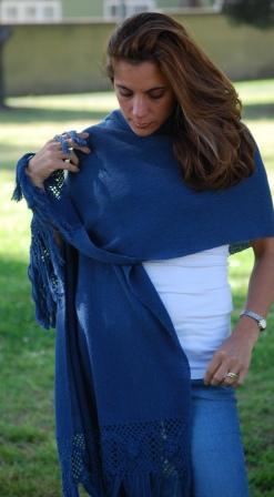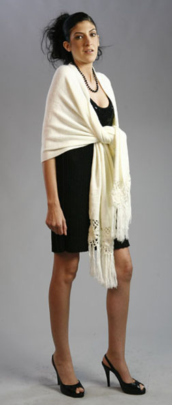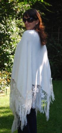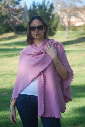 This wrap is shorter than our classic wrap. Versatile with a delightful finished handmade crochet edge, one of a kind. It could be worn open, belted or with a brooch. Light Wrapping is also an option to wear this beautiful garment; the fiber is very light weight and holds different shapes. One size fits all. Available upon request for plus or petit women. Good in plain colors (see color suggestion). Hand Made Item. We keep small inventory of it.